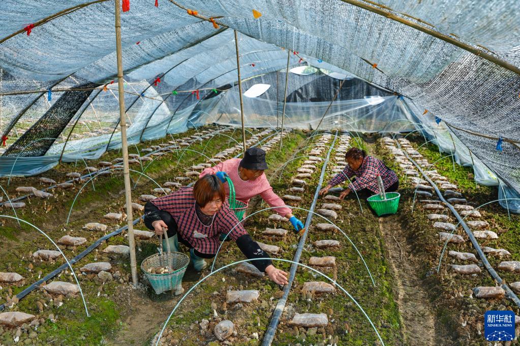 在四川省成都市大邑縣新場(chǎng)古鎮燈籠社區的一處種植大棚里,當地村民在采摘羊肚菌(3月8日攝)。