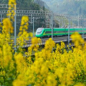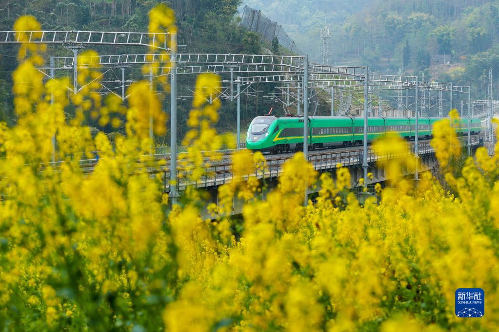 3月10日,復興號動(dòng)車(chē)組開(kāi)行在新成昆鐵路上,鐵路附近的油菜花吐露芬芳。