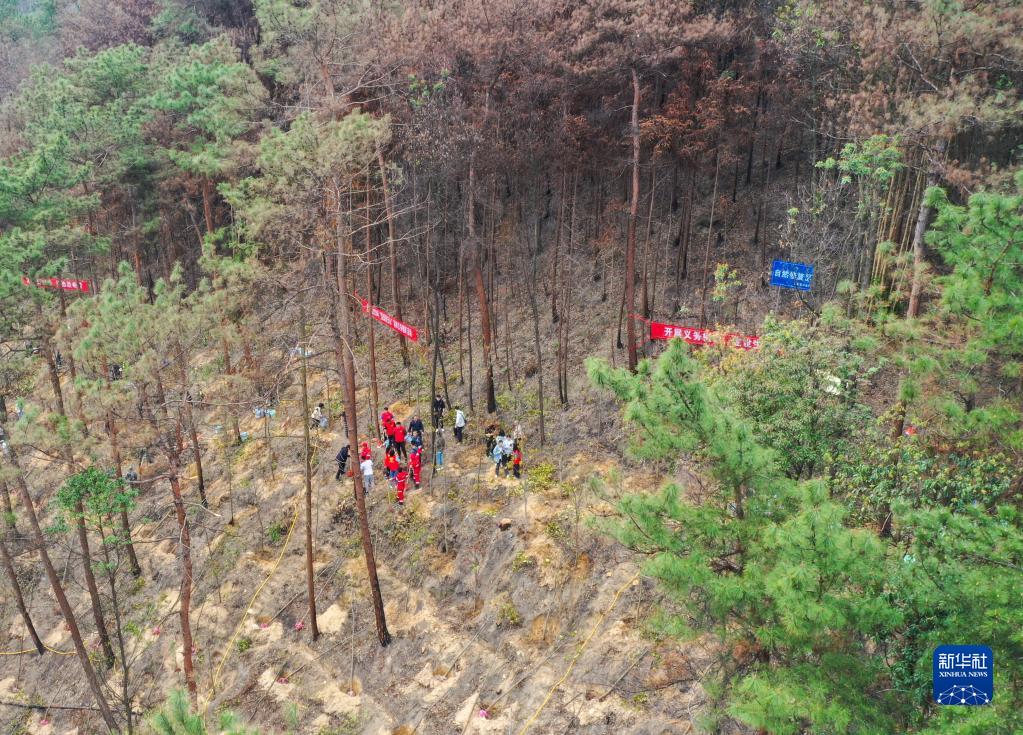 3月9日,在位于重慶市北碚區的縉云山防火主隔離帶附近,社會(huì )各界人士在進(jìn)行植樹(shù)活動(dòng)(無(wú)人機照片)。