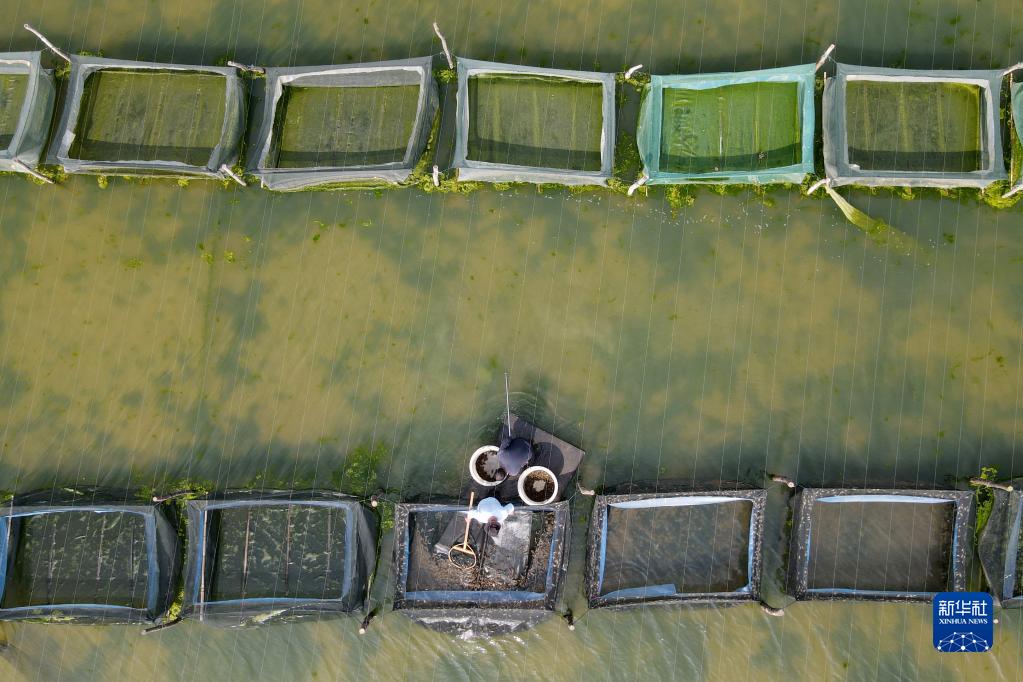 3月9日,在安徽省蚌埠市五河縣申集鎮,蟹農從網(wǎng)箱中撈出培育好的蟹苗(無(wú)人機照片)。
