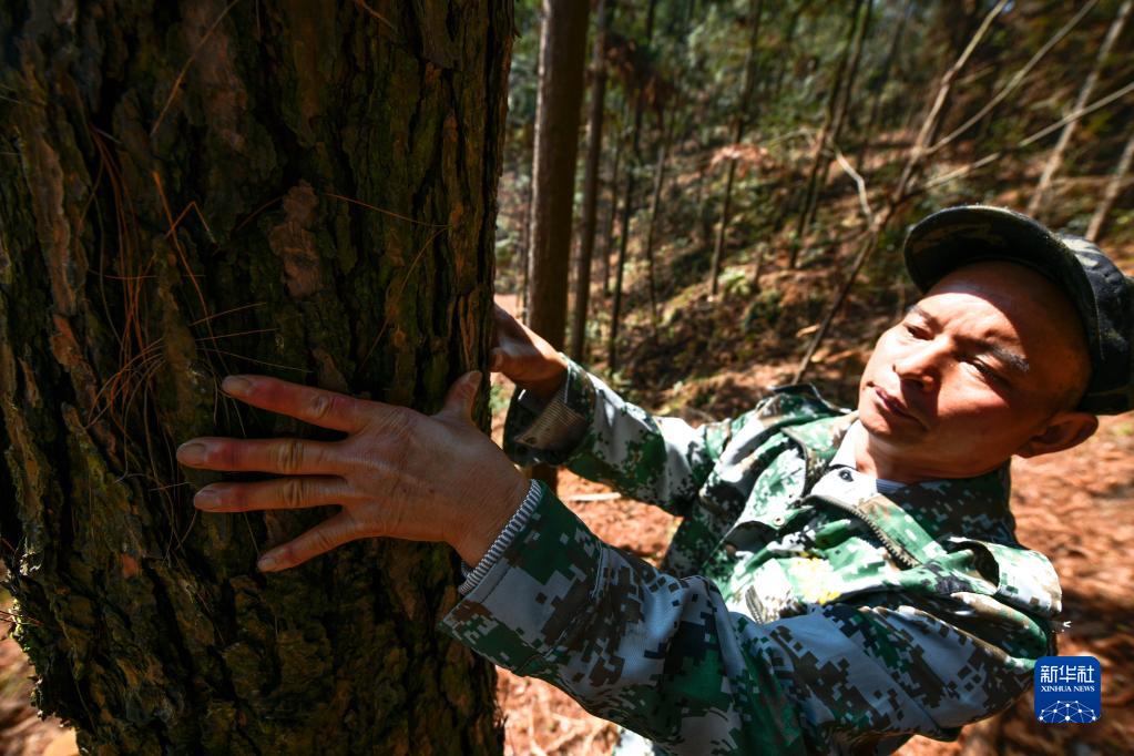 3月9日,黃同維在林區巡山時(shí),用手量一棵松樹(shù)的直徑。