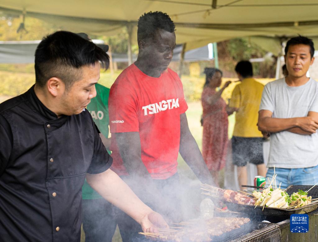 3月11日,在肯尼亞首都內羅畢舉辦的青島啤酒節上,廚師為游客們準備燒烤小食。