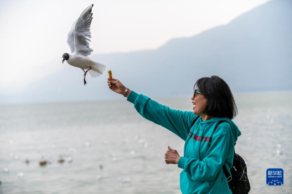 3月12日,一名游客在昆明海埂公園喂紅嘴鷗。