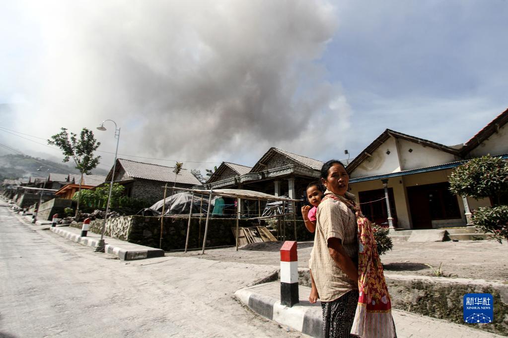 3月12日,在印度尼西亞博約拉利,一名女子抱著(zhù)孩子站在房屋前,遠處是默拉皮火山噴發(fā)的火山灰。