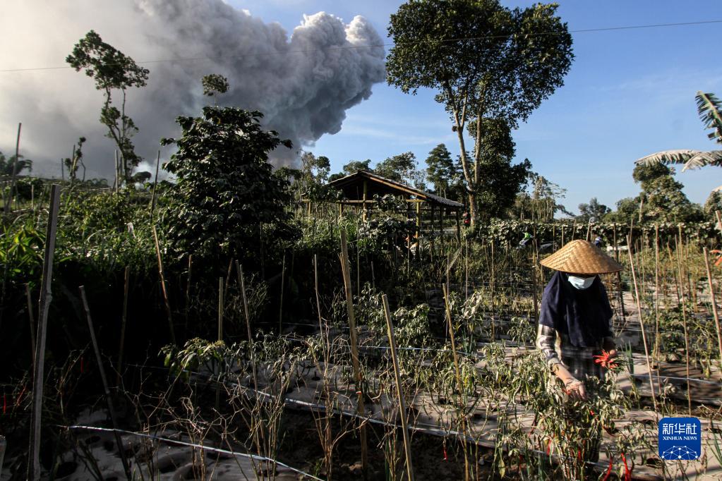 3月12日,在印度尼西亞博約拉利,一名農民在采摘辣椒,遠處是默拉皮火山噴發(fā)的火山灰。