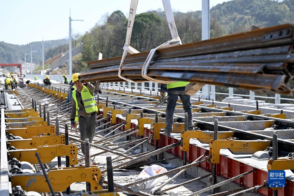 3月14日,在中鐵十一局池黃鐵路建設現場(chǎng),工人進(jìn)行無(wú)砟軌道施工作業(yè)。