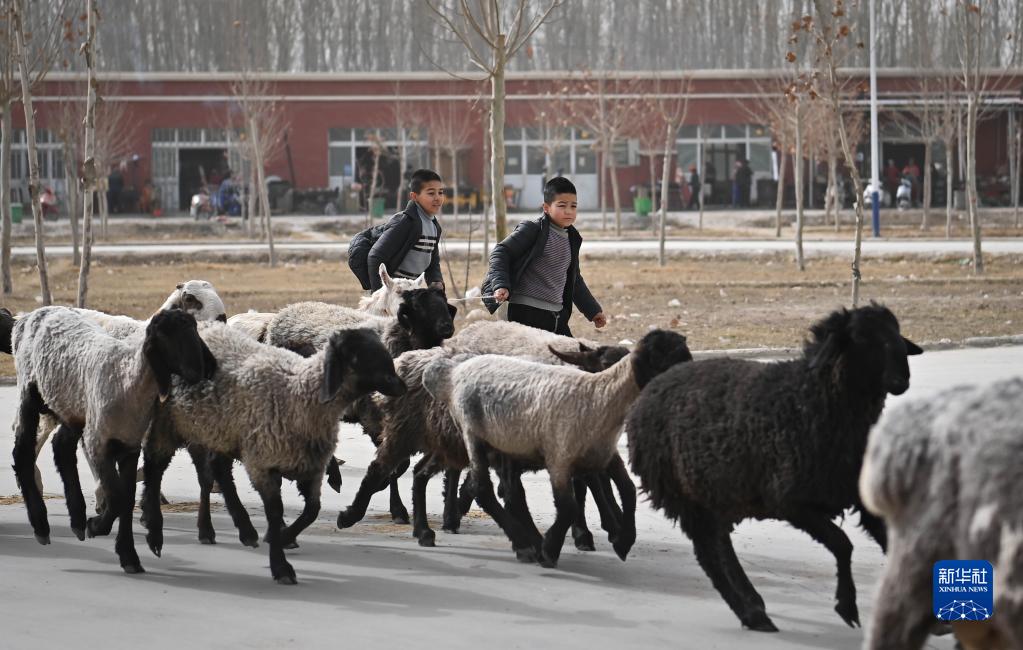 新疆莎車(chē)縣米夏鎮的牛羊巴扎上,兩名兒童在趕羊(3月12日攝)。