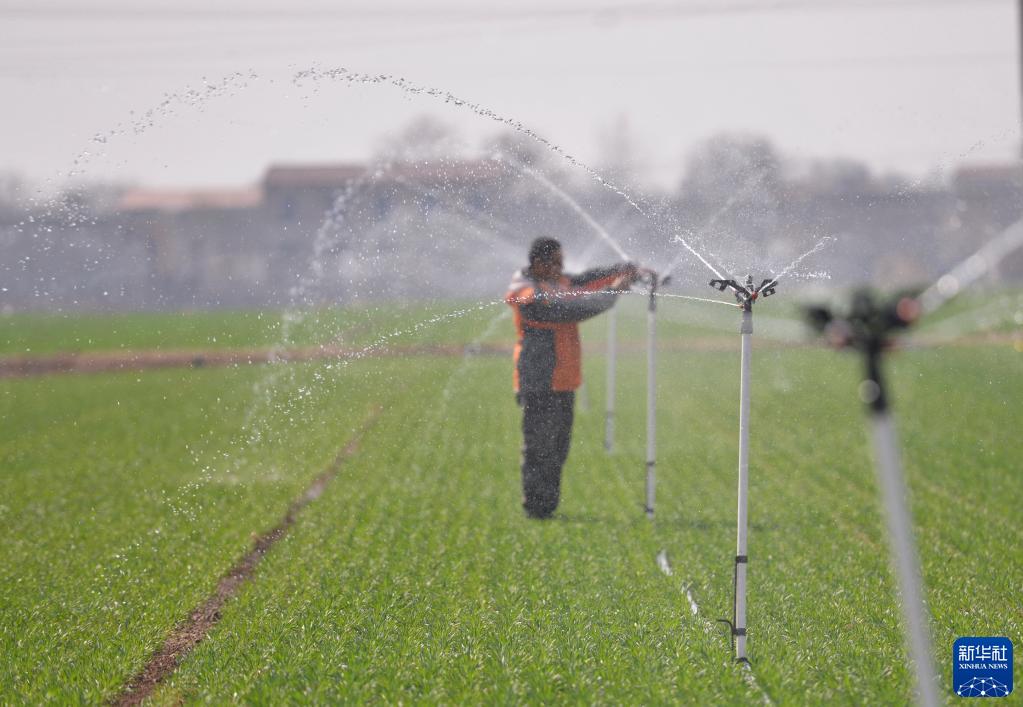 3月14日,河北省晉州市槐樹(shù)鎮北白水村一家農業(yè)合作社的社員在田間使用噴灌設備給冬小麥澆水。
