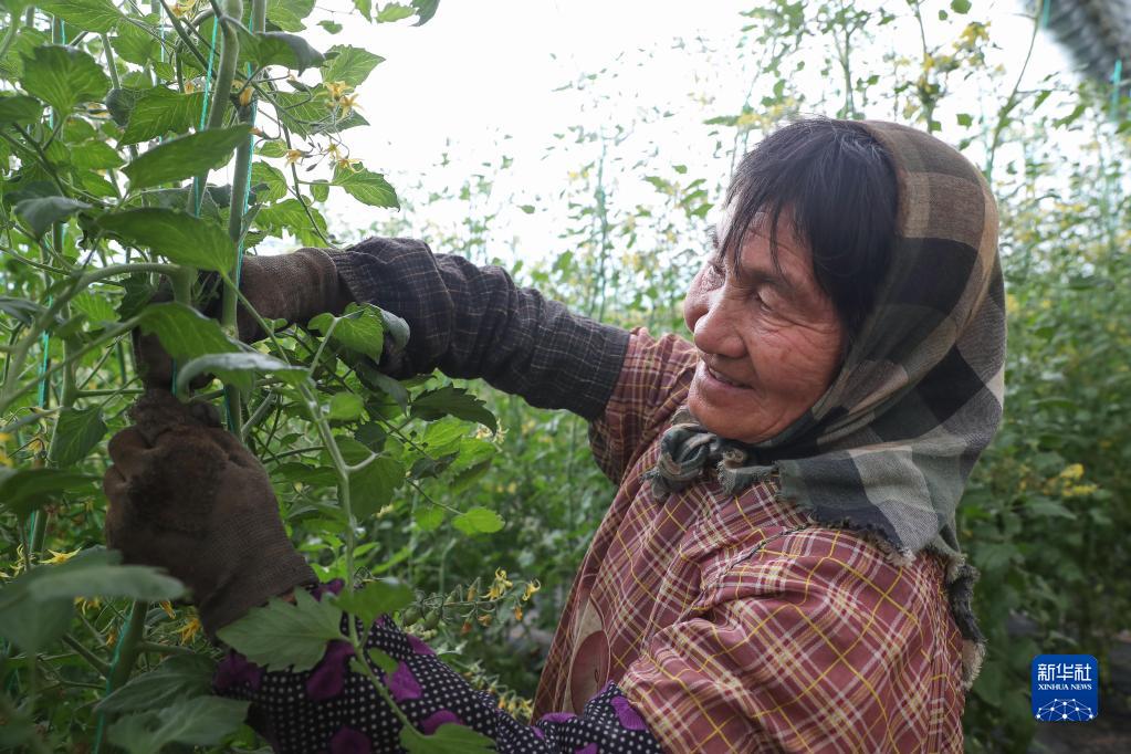 3月14日,村民在岫巖縣洋河鎮的圣女果大棚中固定圣女果的枝蔓。