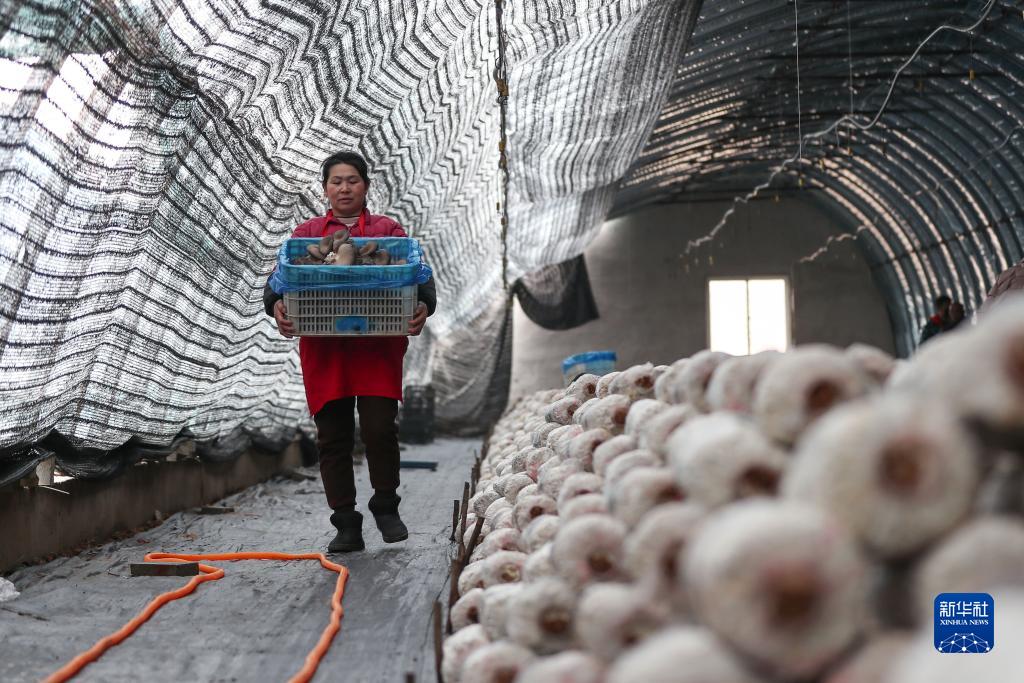 3月14日,村民在岫巖縣三家子鎮的平菇大棚搬運蘑菇。
