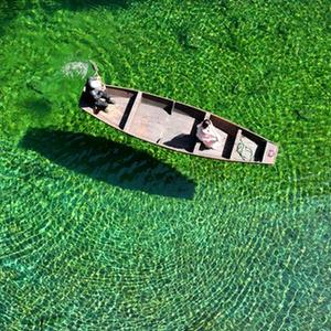 湖北省恩施土家族苗族自治州鶴峰縣容美鎮屏山村屏山旅游景區河水清澈見(jiàn)底,舟行水上如懸浮空中,美如畫(huà)卷。