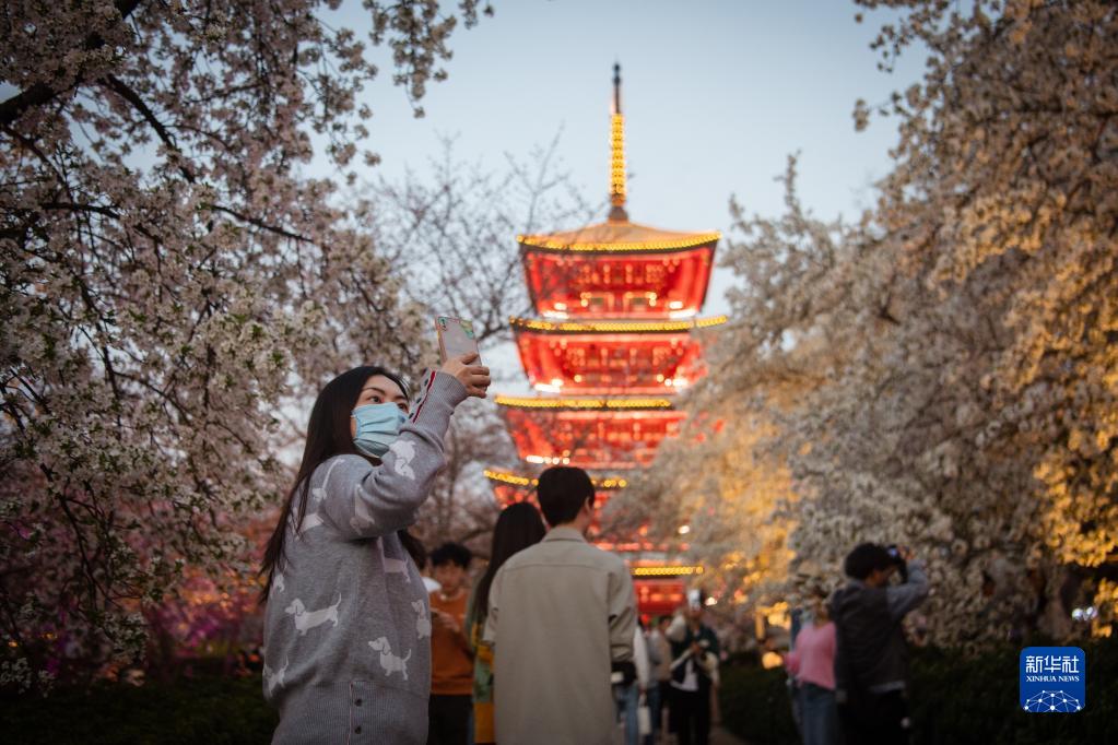 近日,湖北武漢東湖櫻園的櫻花競相綻放,吸引眾多游客前來(lái)踏青賞花,樂(lè )享春光。