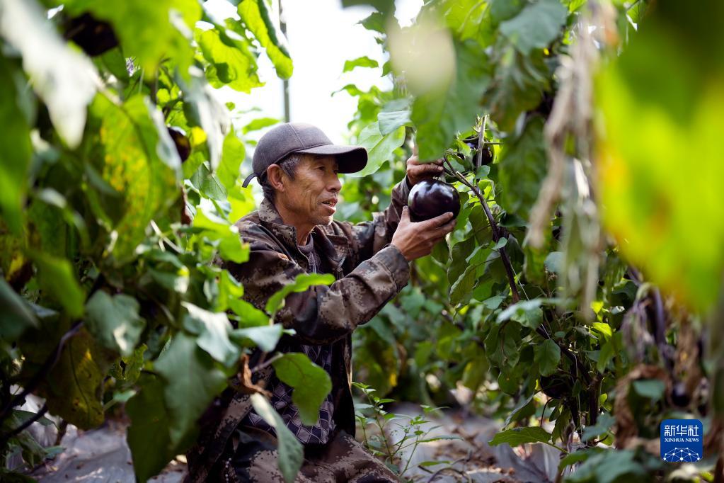3月15日,河北省樂(lè )亭縣一家農業(yè)開(kāi)發(fā)企業(yè)的工人在大棚內采摘茄子。