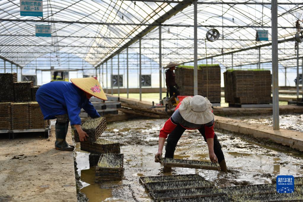 3月15日,農民在向陽(yáng)紅現代農業(yè)智能化集中育秧工廠(chǎng)內放置早稻秧盤(pán)。