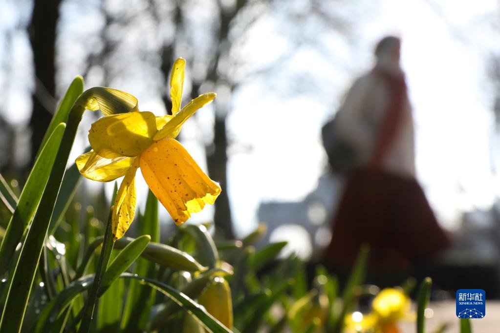 3月15日,一名行人經(jīng)過(guò)比利時(shí)布魯塞爾五十周年紀念公園綻放的水仙花。