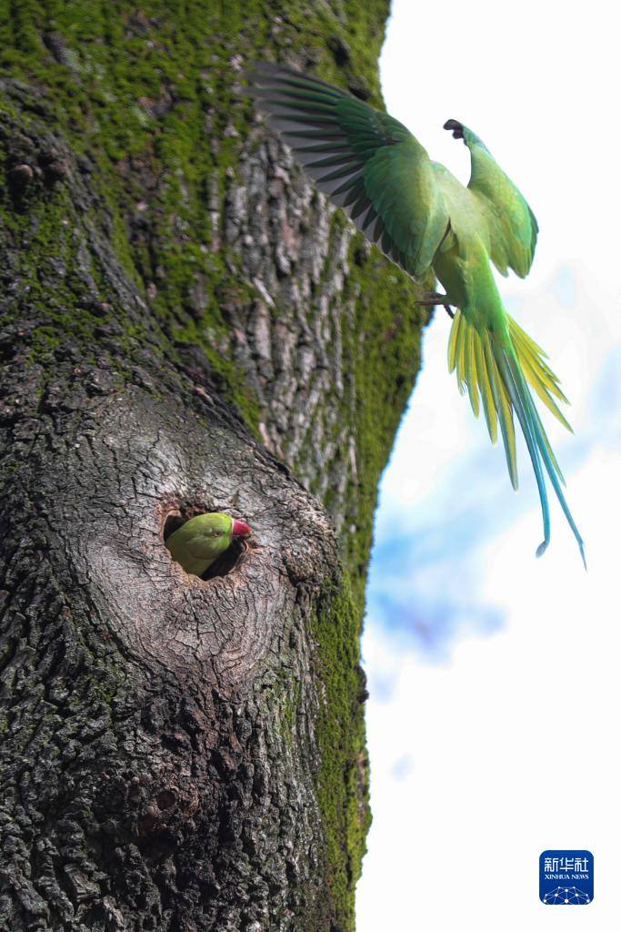 這是3月15日在比利時(shí)布魯塞爾五十周年紀念公園拍攝的兩只鸚鵡。