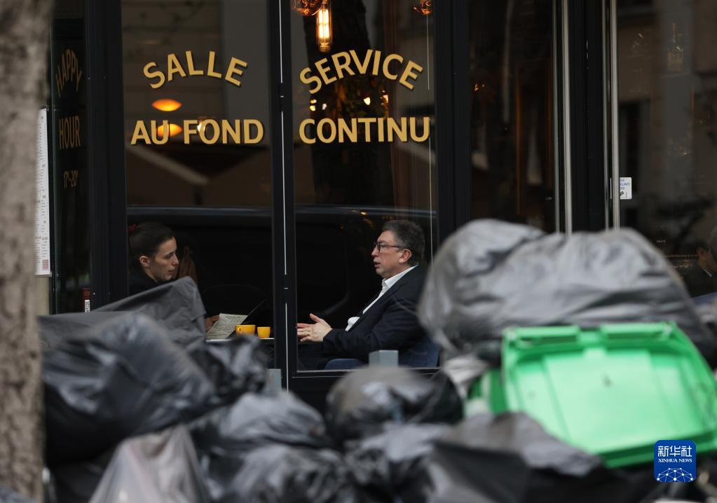 3月15日,人們在法國巴黎一家門(mén)口堆滿(mǎn)垃圾的餐館用餐。