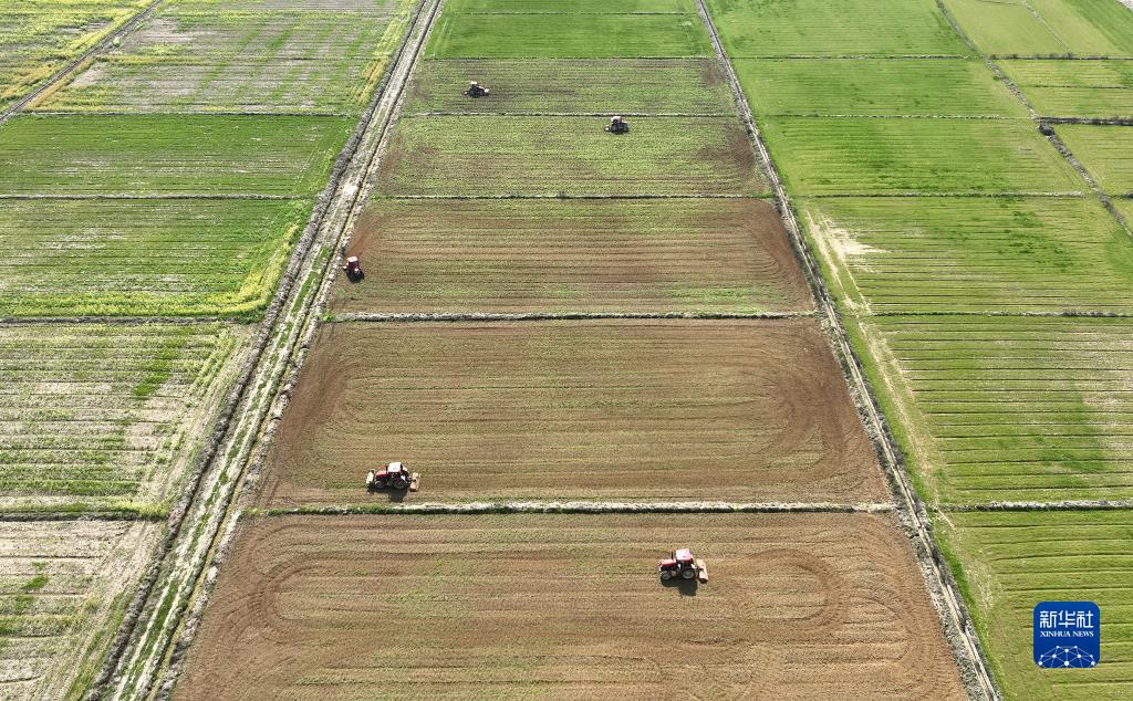在江西省南昌縣大田農社,農民駕駛農機在稻田里耕作(3月15日攝,無(wú)人機照片)。