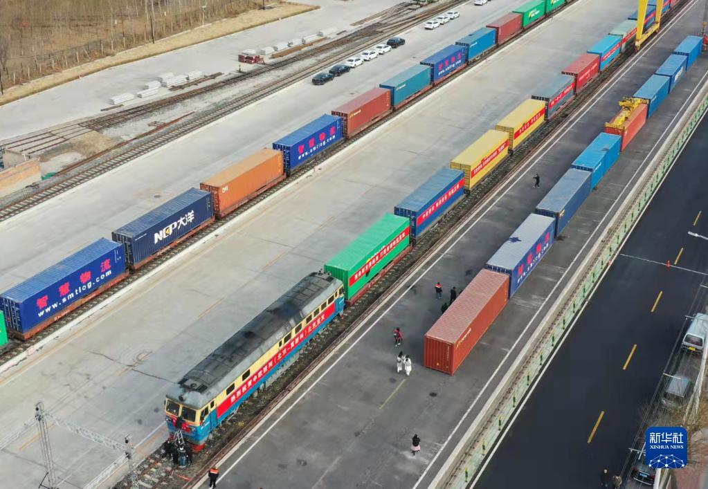 3月16日,在平谷地方鐵路馬坊站,京平綜合物流樞紐中歐班列(北京-莫斯科)??吭谡九_(無(wú)人機照片)。