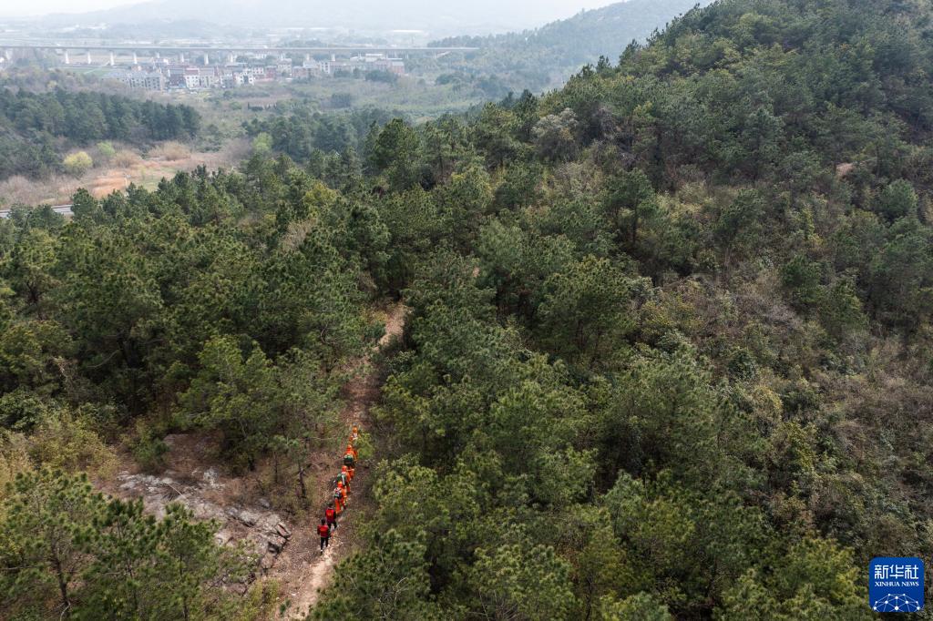 3月16日,道場(chǎng)鄉綜合森林火災應急救援隊隊員和黨員志愿者一同巡查轄區林區森林火災隱患(無(wú)人機照片)。