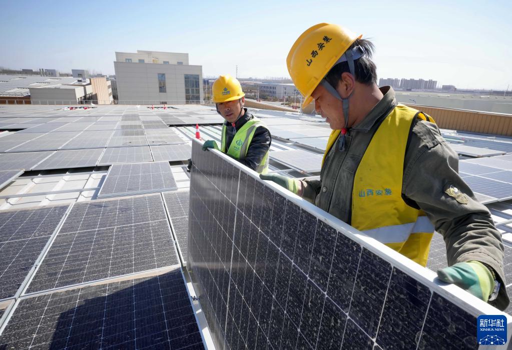 3月16日,工人在唐山市蘆臺經(jīng)濟開(kāi)發(fā)區一家企業(yè)廠(chǎng)房屋頂上安裝太陽(yáng)能光伏發(fā)電板。