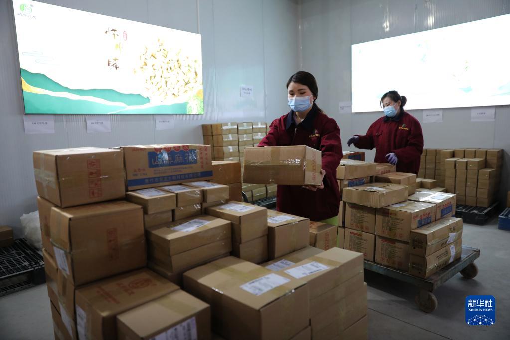 3月16日,在河南省武陟縣農友種植專(zhuān)業(yè)合作社,工人打包好準備快遞的山藥產(chǎn)品。