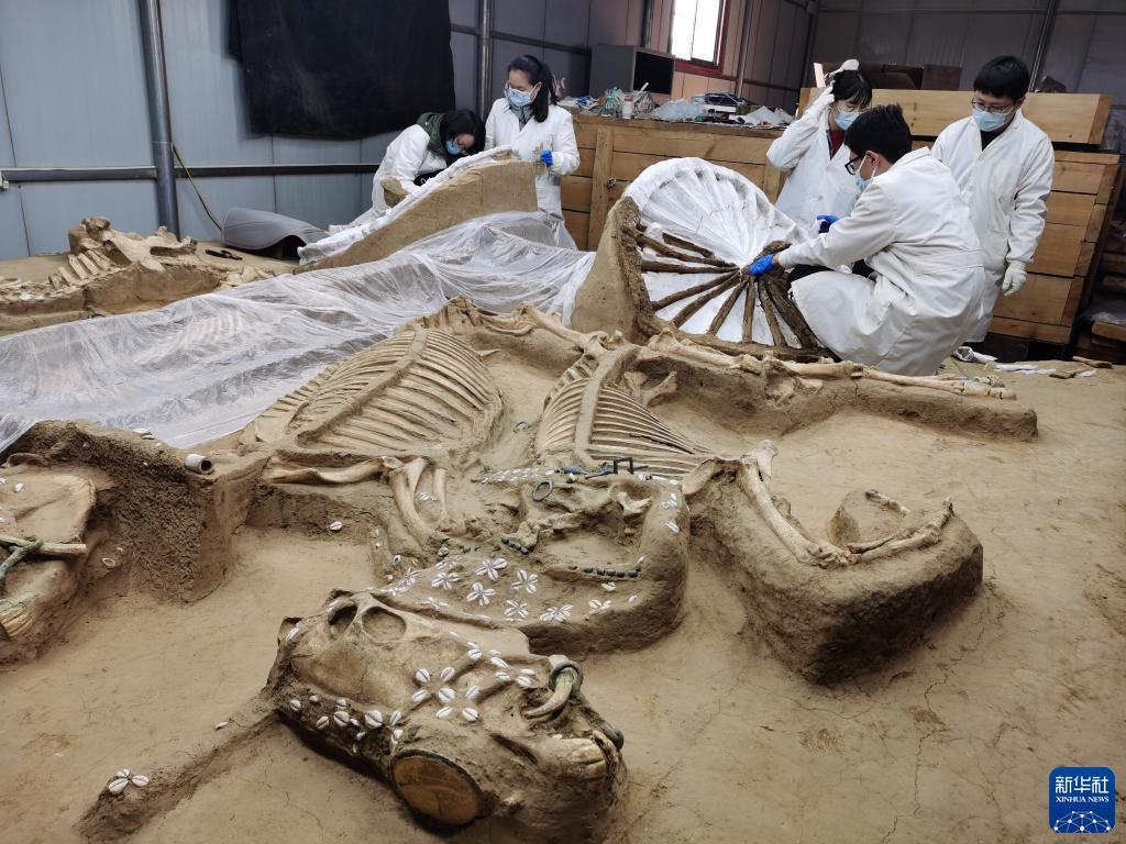 3月16日,在河北行唐故郡遺址考古實(shí)驗室,工作人員在對二號車(chē)馬坑的3號車(chē)進(jìn)行清理。