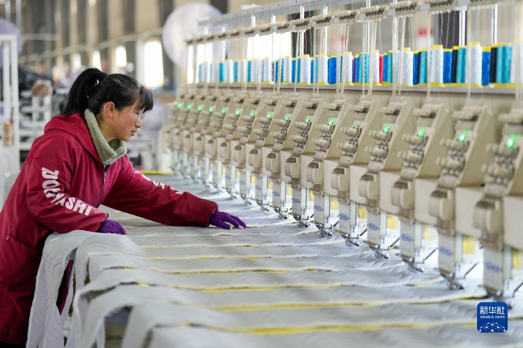 3月16日,河北省玉田縣窩洛沽鎮一家床墊制造企業(yè)的工人在生產(chǎn)線(xiàn)上工作。