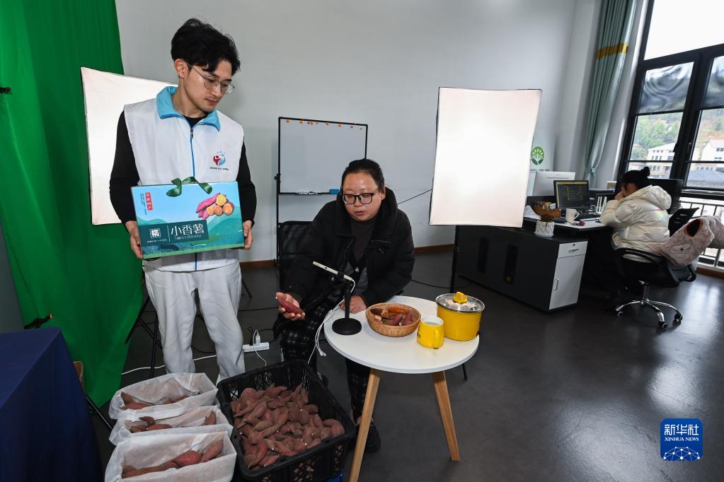 3月17日,在清涼峰鎮農創(chuàng )客中心,青年志愿者(左一)和農創(chuàng )客一起直播推廣當地農特產(chǎn)品。