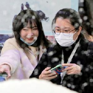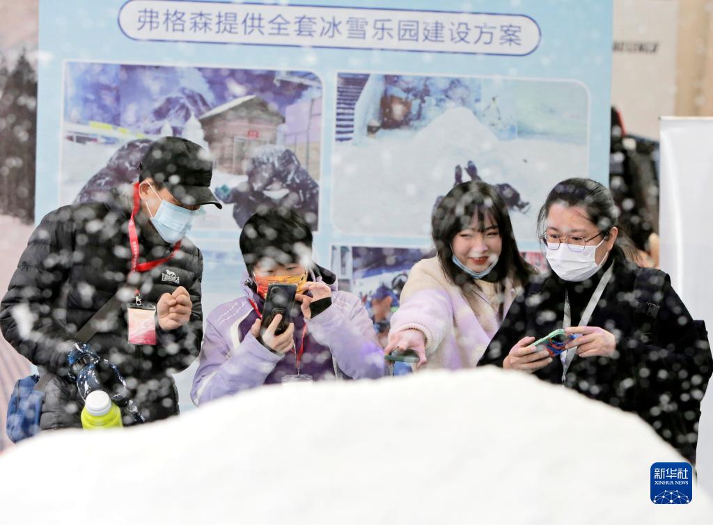 3月17日,參會(huì )者在2023哈爾濱冰雪博覽會(huì )上參觀(guān)飄雪機設備。
