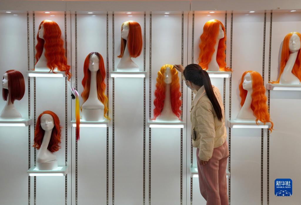 3月16日,市民在河南瑞貝卡發(fā)制品股份有限公司的展廳內挑選假發(fā)。