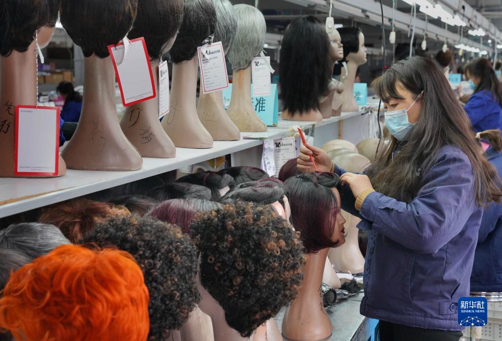 3月16日,工作人員在河南瑞貝卡發(fā)制品股份有限公司的生產(chǎn)車(chē)間里制作假發(fā)。