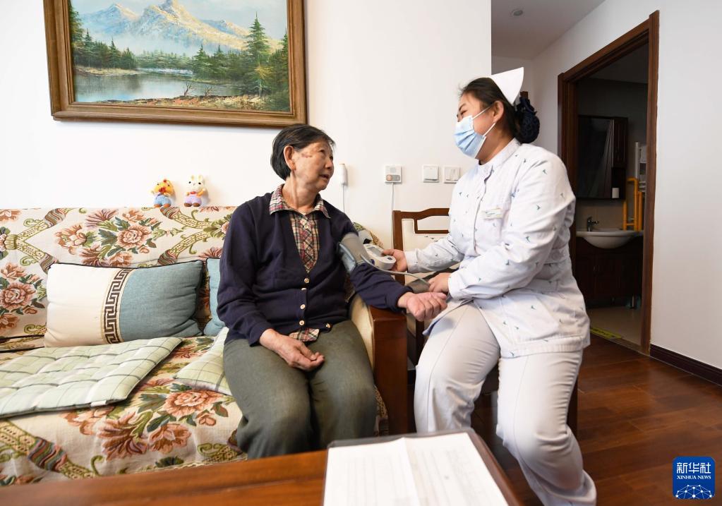 3月17日,三河市燕達金色年華健康養護中心家居區值班護士為老人做健康監測。