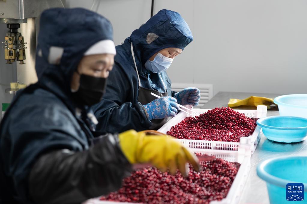 3月15日,在大興安嶺益康野生食品加工有限公司生產(chǎn)車(chē)間內,工人在篩選野生蔓越莓。