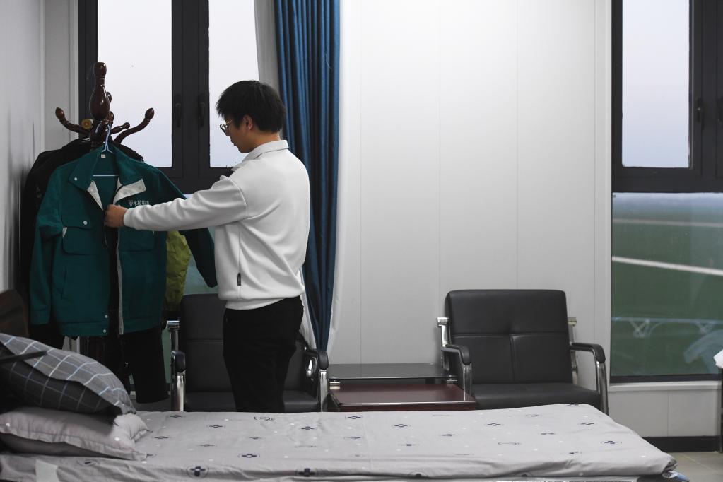 3月14日,在西平縣老王坡高標準服務(wù)中心的宿舍內,臺曉林下班后換下工作服、整理衣架。