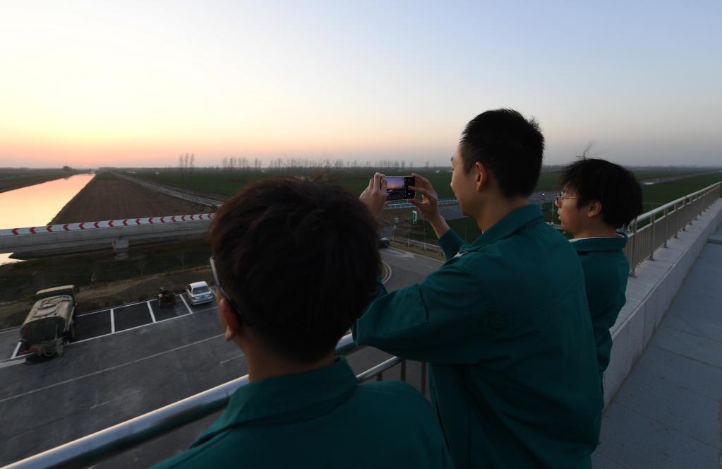 3月14日,在西平縣老王坡高標準服務(wù)中心的二樓平臺,臺曉林(右)、王英凡和王仲琦(左)下班后在看夕陽(yáng)。