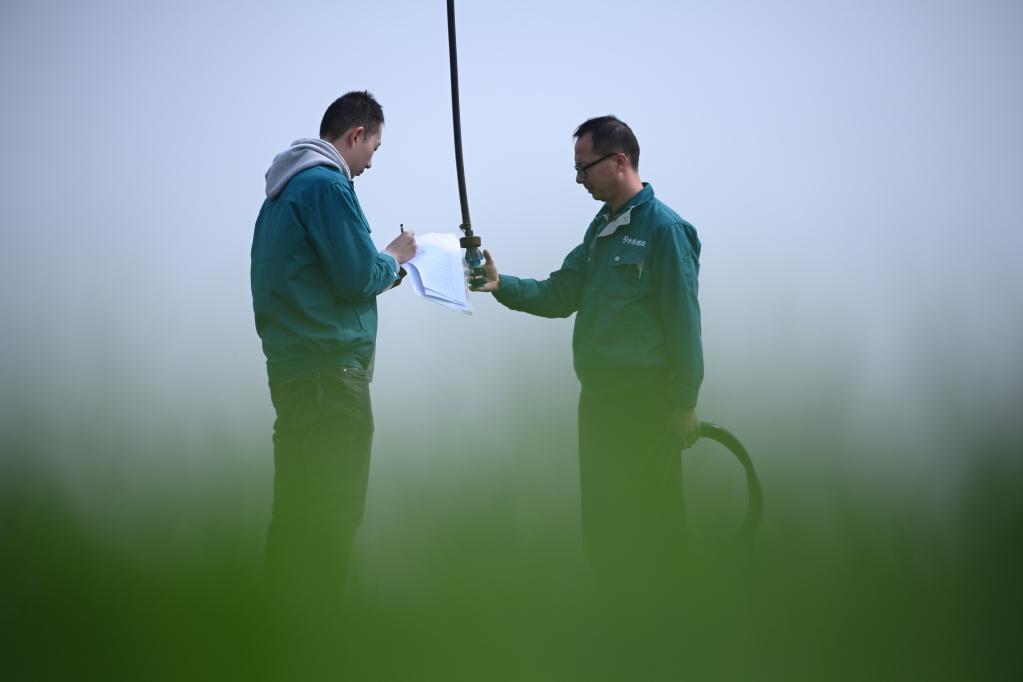 “這個(gè)噴頭換過(guò)了,你登記好?!痹诤幽鲜●v馬店市西平縣高標準農田示范區的麥田里,河南水投柏農產(chǎn)業(yè)發(fā)展有限公司運營(yíng)管理部負責人劉亞輝一邊擰好噴灌機的新噴頭,一邊叮囑一起巡檢的王英凡。