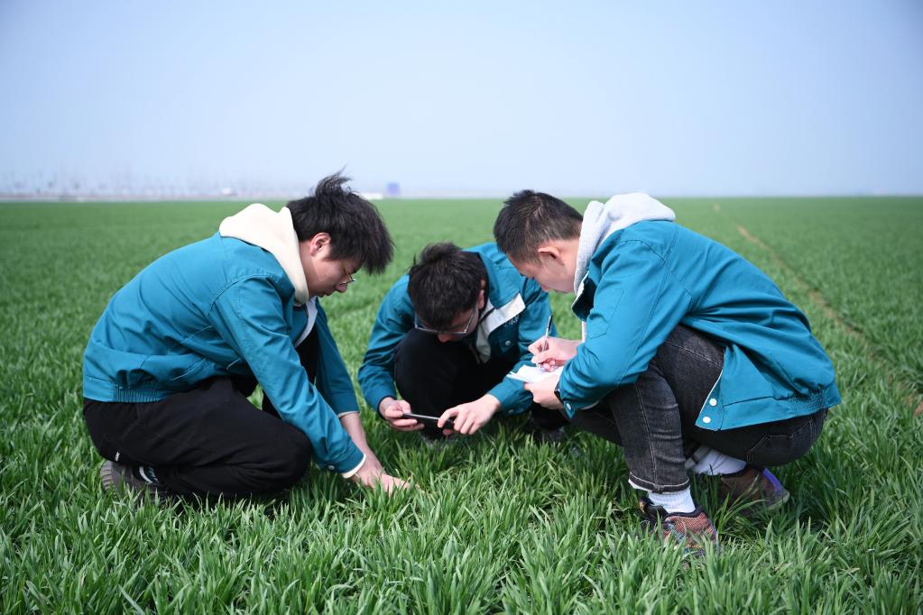2月28日,在西平縣老王坡高標準農田示范區,臺曉林(左)、王仲琦和王英凡(右)一起觀(guān)察苗情草情并記錄。