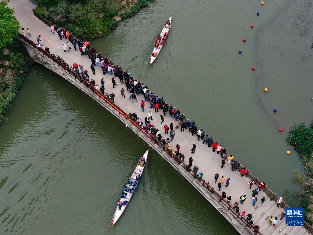 3月18日,人們在福州流花溪的一座小橋上觀(guān)看龍舟賽(無(wú)人機照片)。