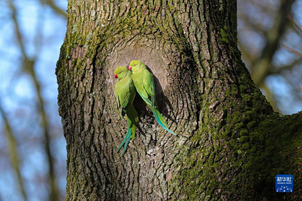 3月15日,在比利時(shí)布魯塞爾五十周年紀念公園,兩只鸚鵡在樹(shù)上棲息。