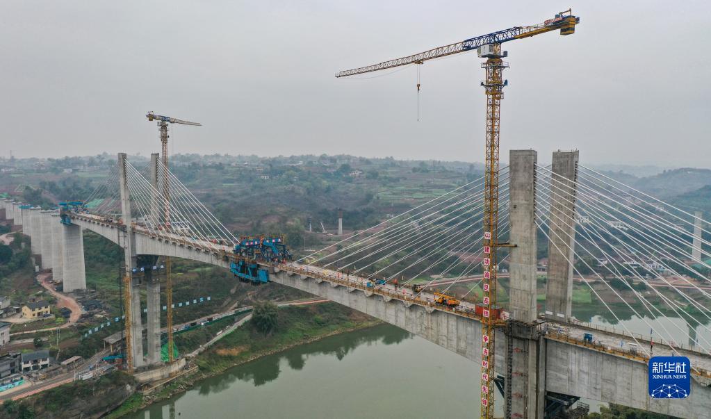3月18日在四川省瀘州市拍攝的渝昆高鐵瀘州沱江特大橋主跨合龍施工現場(chǎng)(無(wú)人機照片)。
