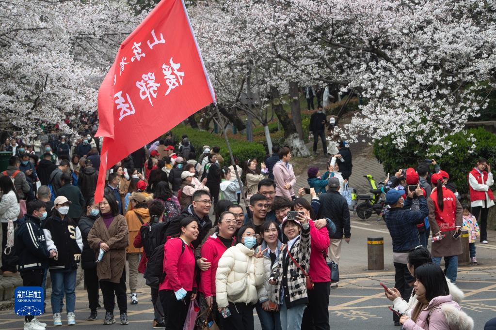 當日,武漢大學(xué)舉行抗疫醫護賞櫻專(zhuān)場(chǎng)。珞珈山下,來(lái)自全國各地的1.6萬(wàn)余名抗疫醫護人員及家屬赴約賞櫻。