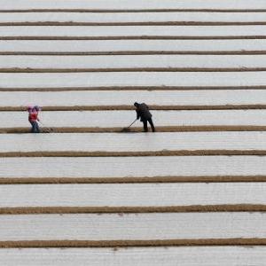 3月18日,唐山市曹妃甸區第六農場(chǎng)一家農業(yè)合作社的社員在使用機械設備播種(無(wú)人機照片)。