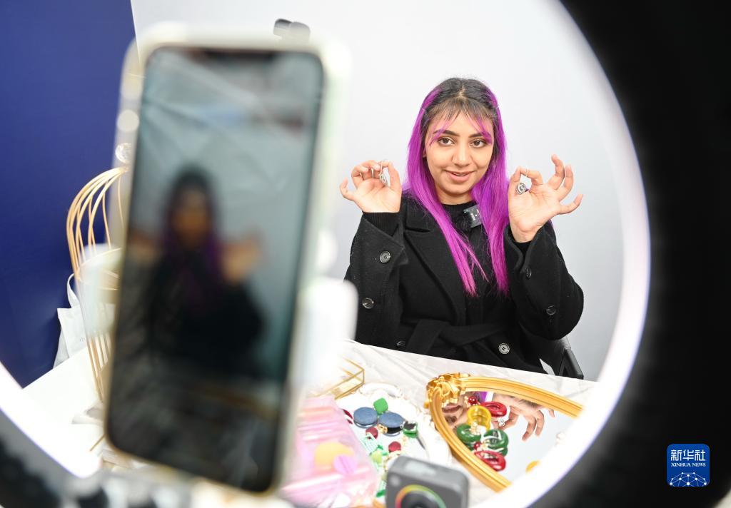 3月18日,來(lái)自巴基斯坦的邵一曼在展位進(jìn)行直播。