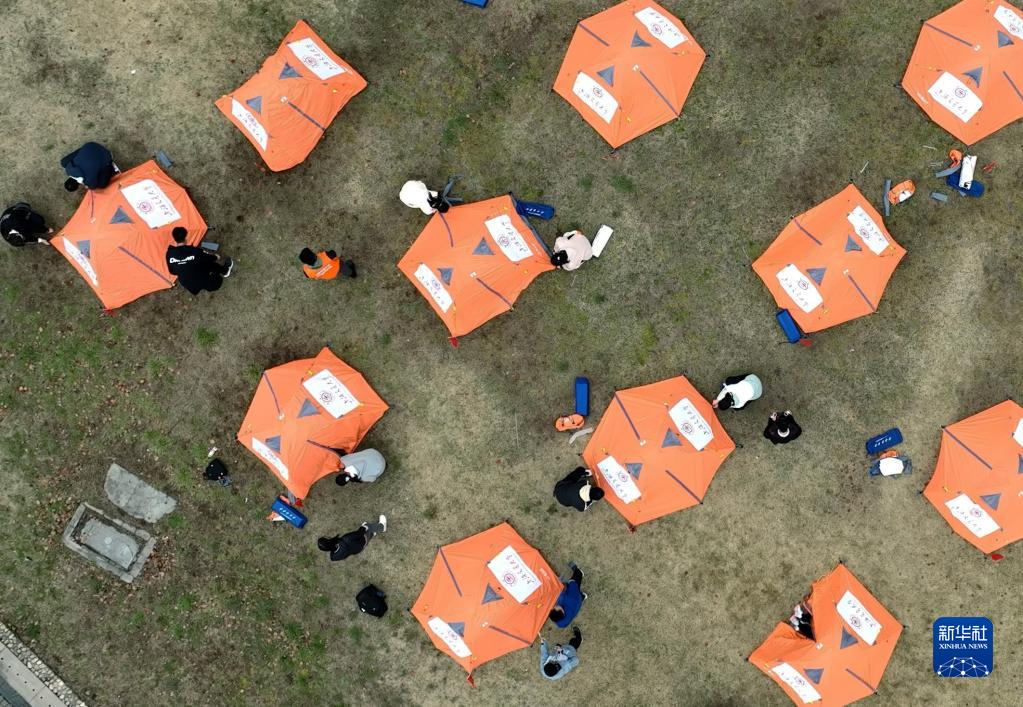 3月18日,在上海交通大學(xué)的野外生存勞動(dòng)課上,學(xué)生們在校園大草坪上的“駐扎點(diǎn)”快速扎好帳篷(無(wú)人機照片)。