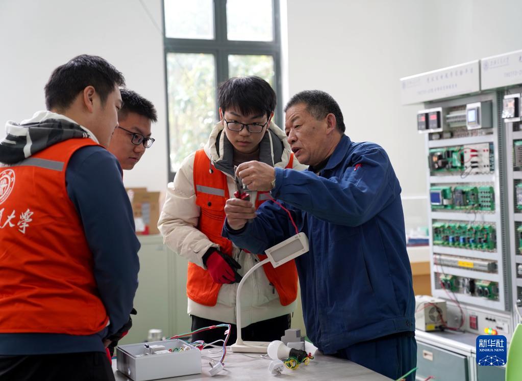 3月18日,在上海交通大學(xué)閔行校區的智能電網(wǎng)大樓,電工師傅潘國才指導學(xué)生組裝智能配電箱。