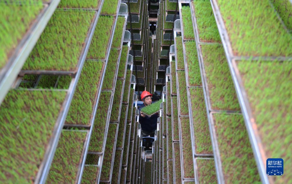 3月18日,湖南省衡陽(yáng)市衡山縣白果鎮棠興村智能化育秧基地,村民在查看秧苗生長(cháng)情況。