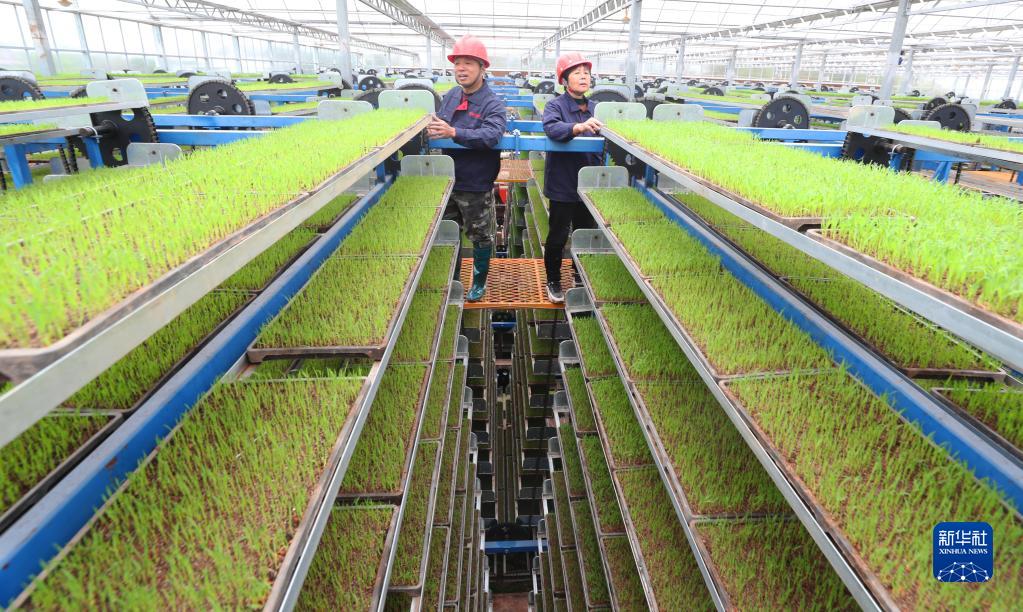 3月18日,湖南省衡陽(yáng)市衡山縣白果鎮棠興村智能化育秧基地,村民在查看秧苗生長(cháng)情況。