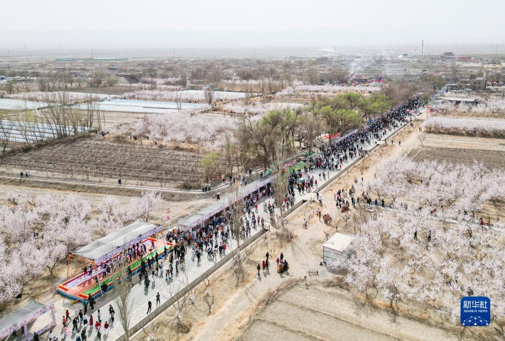 3月18日,游客在吐魯番杏花節現場(chǎng)游玩(無(wú)人機照片)。