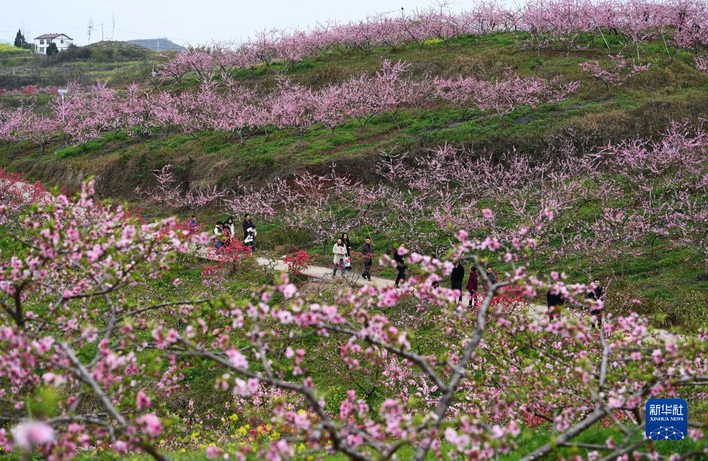 3月18日,游客在四川省南充市蓬安縣新園鄉寬敞溝村桃花園里賞花游玩。